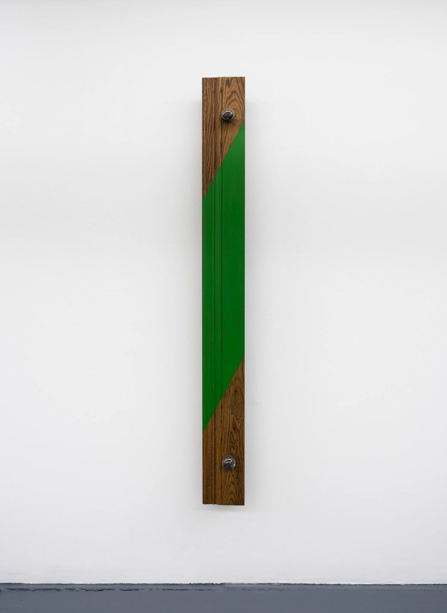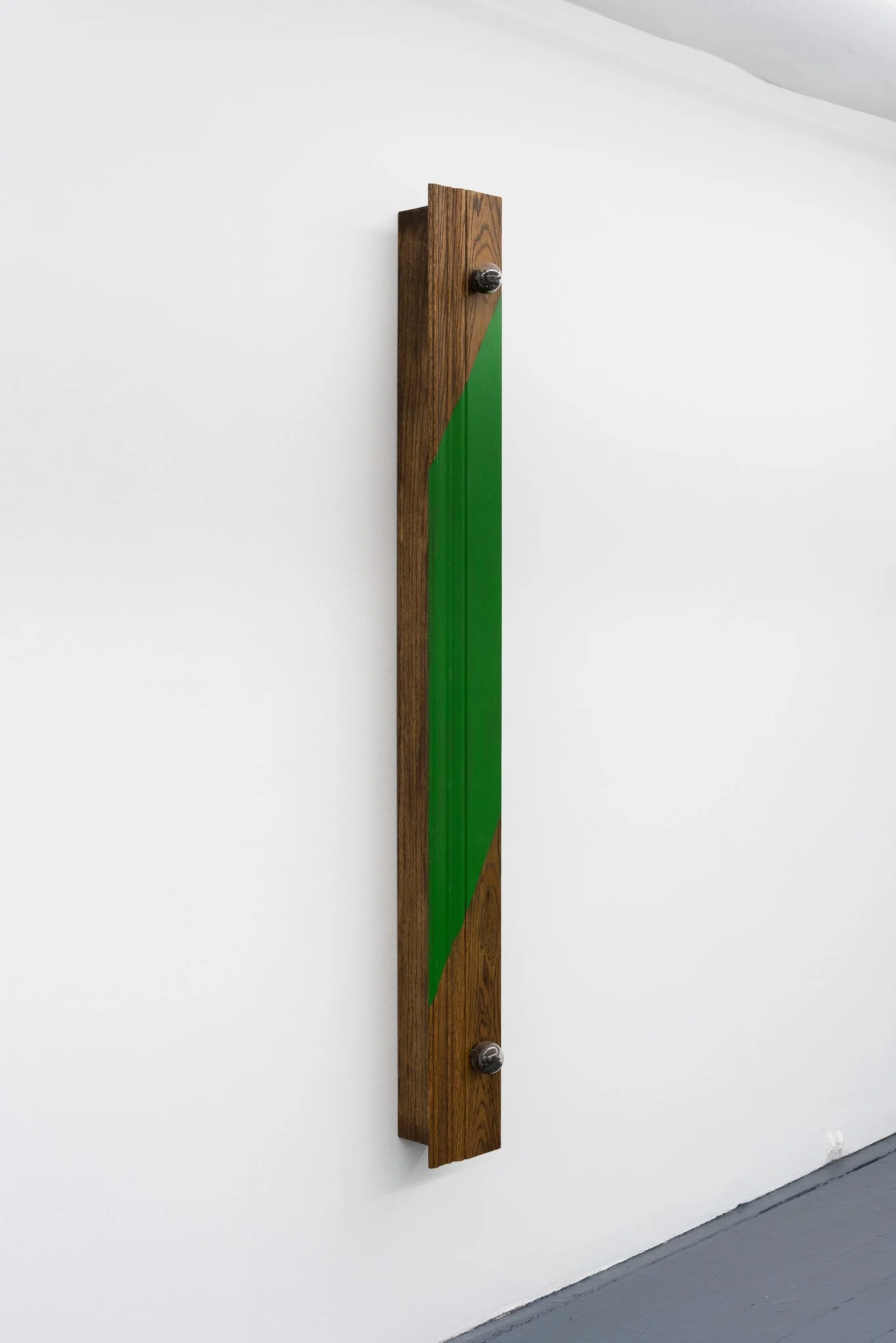 Red oak baseboard, oil stain, acrylic, incandescent light bulb, candelabra socket, burnt matches